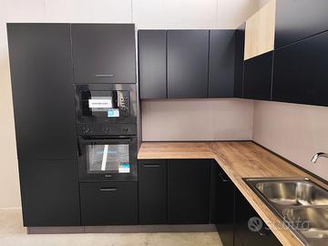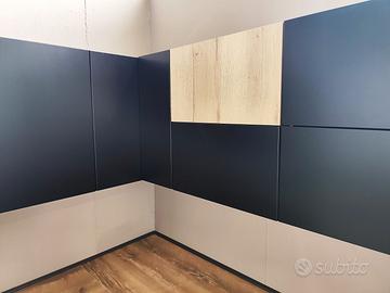 Le ante sono tutte in MDF laccate nero opaco, fatta eccezione per due nei pensili effetto rovere nodato chiaro.