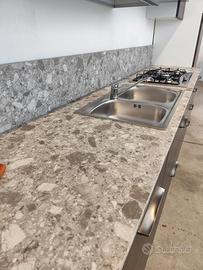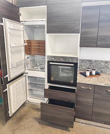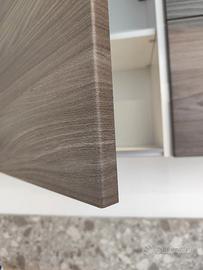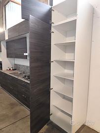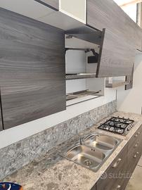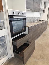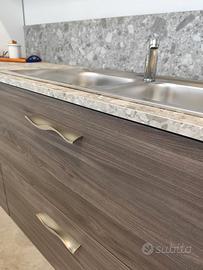 Cucina modello Papaia color Olmo Tundra, di fine serie da 495 cm ma adattabile alla vostra parete poiché sono disponibili (fino ad esaurimento scorte) diversi elementi con misure diverse. La adattiamo secondo le vostre esigenze grazie ad un top incluso nel prezzo da 70 cm ancora da tagliare e forare. I doppi pensili creano una cornice ed un gioco di profondità diverse. Le maniglie dalla linea sinuosa sono in acciaio cromato. Cassetti, cestoni ed ante sono rallentati grazie alle cerniere della Blum. Tutti gli schienali sono rinforzati con sp. 6 mm. Lo zoccolo è in alluminio H12 cm. Come visibile in foto, questa cucina è compresa già di colonna dispensa. Gli elettrodomestici inclusi nel prezzo sono: - frigorifero 320 lt lordi ad incasso; - forno ventilato multifunzione; - lavello 2 vasche inox; - piano cottura 5 fuochi inox; - cappa esterna da 90 cm a "T" inox Predisposizione per lavastoviglie (non inclusa nel prezzo; disponibili modelli in magazzino di fine serie nuovi). Effettuiamo trasporto e montaggio con prezzo a parte da calcolare in base ai km ed al piano dell'abitazione. C'è la possibilità di pagamento rateizzato con finanziamento.