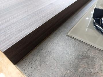 Il top è di alta qualità, finitura grezza color grigio tortora. Il piano cottura Indesit in vetro tortora è abbinato al forno, anch’esso Indesit in vetro tortora. Presente lavello a vasca unica con rubinetto a doccetta regolabile con tre tipi di getto. La cappa è una Smeg inox e vetro (KEIWO). Lavastoviglie Electrolux, tutto funzionante.