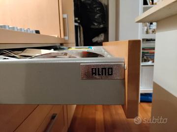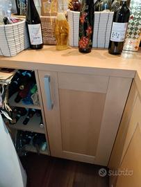 Cucina in legno massello di betulla rosa ed elettrodomestici AEG. Colonna forno microonde e forno elettrico ventilato, frigorifero e lavapiatti.