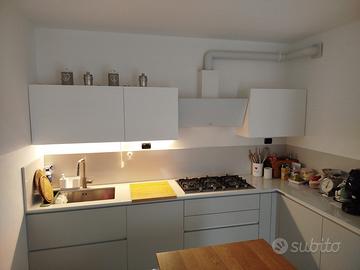 Cucina Arredo3 basi color fango chiaro , pensili e cappa elica colore bianco, compresa isola Ikea.