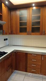 Vendo cucina angolare in legno, completa di lavello in acciaio Franke a due vasche, cappa filtrante, piano cottura cinque fuochi Whirlpool, lavastoviglie e frigorifero, forno e forno microonde, esattamente come da foto. Dimensioni cm368x356 Smontaggio e trasporto a carico dell'acquirente.