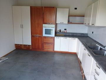 Cucina 3,80x4,70 Bianco e legno, top grigio scuro In ottimo stato Con piano cottura, cappa, forno e lavandino