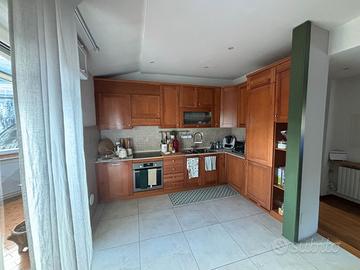 Basi e Pensili: Ampia metratura con pensile a vetrina satinata, colonna forno e cassettiera.
