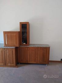 Cucina angolare in legno massello e piano in marmo fatta su misura da falegname, lavandino inox doppia vasca, 234x60 ,angolo 90x63 , isola indipendente con due sportelli 140x40 sormontata da pannello in legno con faretti e vetrina angolare 97x37x37
