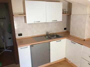 Come da titolo vendo cucina angolare, a causa di immediata necessità di spazio. La cucina è compresa di piano cottura, forno, cappa di aspirazione e acquaio. Disponiamo di un altro pezzo di una seconda cucina, che puo essere aggiunto al lotto per pezzi di ricambio (ante, maniglie, cassetti etc.)