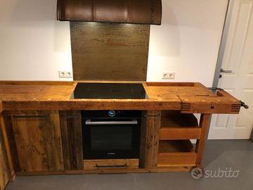 Cucina angolare in legno massello, stile Banco da Falegname / Industrial, predisposta per lavello ed elettrodomestici ad incasso, con cassetti a giorno, base d'appoggio di notevole spessore con ribassamenti solitamente utilizzati per bottiglie vasi e spezie, tubo in ferro ad uso porta strofinacci e morsa posti ai lati del banco, la cucina non prevede pensili, ma ben si mensole (opzionali) a muro nel medesimo stile, anche la console su ruote è opzionale e acquistabile separatamente.