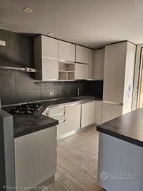 Cucina angolare con bancone completa di elettrodomestici :capa, piano cottura, forno, lavastoviglie, lavandino con miscelatore è frigorifero tutto