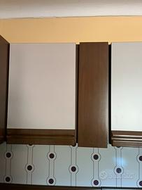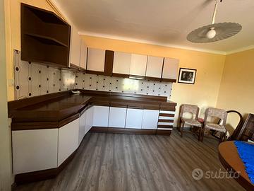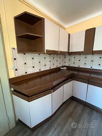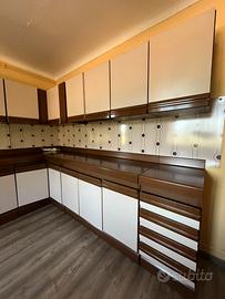 Cucina beige e marrone in ottime condizioni. Misura 195 cm. x 268 cm. Dispone di antina estraibile porta bicchieri e carrello scorrevole porta pentole/ coperchi nell’angolo. Includa anche un tavolo rotondo e cinque sedie. Smontaggio e trasporto a carico dell’acquirente.