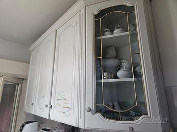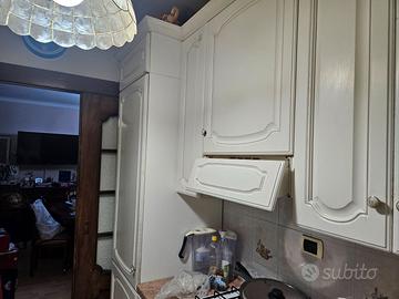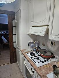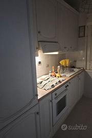 Cucina a composizione lineare con basi, pensili alti, cappa a scomparsa e forno da incasso. Le ante sono nello stesso stile classico sagomato di quelle del pensile con finitura chiara. Anni 80-90' vero legno.