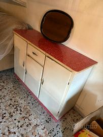 Mettitutto con fondo piastrellato, tavolo con spianatoia e mattarello, 6 sedie (frammento di formica mancante dallo schienale di una sedia), credenza bassa con cassetti e sportelli.