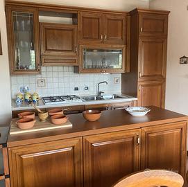 Cucina completa con ante in legno massello completa di scolapiatti, colonna frigo, colonna forno, pensili con vetrinetta, piano di lavoro ad isola centrale e scaffale a giorno a completamento dell’isola centrale tenuta in ottime condizioni