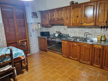 Mobile-credenza con 4 ante sotto e vetrina sopra e vano TV nello stesso stile della cucina.