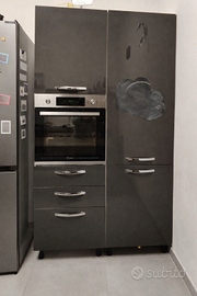 Vendesi cucina moderna con basi grigio scuro lucido, pensili bianchi e top chiaro, senza elettrodomestici ma completa di lavello. La cucina è molto valida e con normale funzionalità interna ma presenta alcuni difetti estetici verificabili in persona o tramite contatto privato. Divise le sezioni misurano 210cm+ 120 cm. Unite la cucina ha una misura di 330 cm. Incluso nel prezzo: Lavello in acciaio inox, top e zoccolatura anche se non presente nella foto. La colonna, originariamente per frigo a incasso, è stata convertita in una generosa dispensa,il fondo è stato cambiato e sono stati aggiunti ripiani in truciolare rifinito di alto spessore, molto più robusti dei classici ripiani standard, ideali per sostenere piccoli elettrodomestici e scorte alimentari pesanti. Soluzione ideale per arredare una seconda casa o un appartamento in affitto. Ritiro: A carico dell'acquirente. la cucina sarà disponibile per fine aprile inizio maggio. È possibile venire a visionarla montata previo appuntamento per rendersi conto degli spazi e dello stato estetico.