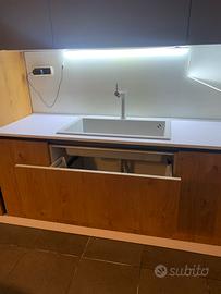 Cucina angolare Aran, tip di gamma. completa di elettrodomestici. Frigorifero, forno, piano cottura, lavello completo, cappa da parete. Finitura in rovere tranciato. Top in phoenix.