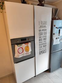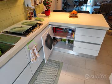 cucina ARAN con piano snack. misure mobile lato lavello e piano cottura 2.20 ml profondità 61 cm. mobile piano snack lungo 1,85 ml profondità 96,5 cm. colonna forno e dispensa larghezza 60+60 h2,00 profondità 0,60. completa da stipetti con cappa e scolapiatti.