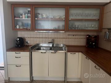 Cucina Arclinea con blocco lavello e blocco fuochi Foster in acciaio da 1.00 m, completa di lavastoviglie nuova, forno e cappa). Tutte le basi sono profonde 70 cm e hanno ante laccate bianco panna, cestoni con guide e laterali in alluminio Arclinea e top tipo tagliere massello (rilevigabile). Misure complessive 2.65x 4.00 ma con possibilita' di diverse combinazioni. Con pensili da 90+90+60 in legno massello e vetro. Piu' il mobile tutto in legno massello con colonna forno e colonna dispensa (dove prima c'era il frigo da incasso che eventualmente si puo' ripristinare). Completa anche di accessori come bacchette da muro con portarotolo e portalibro o accessori interni quali portaspezie o barattoli in vetro. Il costo della spedizione ovviamente varia a secondo della destinazione