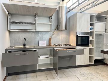 Cucina Arredo3 modello Kalì, finitura fenix grigio, laminato effetto legno bianco.