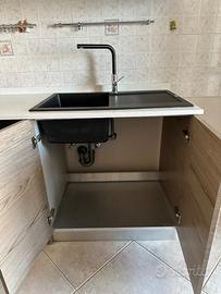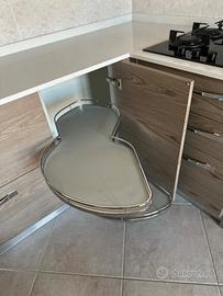 Cucina Arrex angolare. Cassetti tutti estraibili con ritorno rallentato, idem ante, cestello angolare estraibile modello le mans. Posto per fuochi o induzine e lavello. Posto lavastoviglie incassata e forno incassato. Top in quarzo.