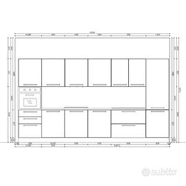 • Pensili: 1 pensile scolapiatti da 90 cm, 3 pensili da 60 cm (per cappa e moduli contenitivi).