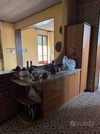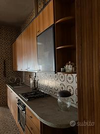 Cucina in stile vintage, composta da mobili in legno chiaro con finiture moderne. La composizione include armadietti funzionali con ampi spazi di stoccaggio, un mobile base con piano in marmo, e un elegante mobile a colonna con ripiani. Il design retrò è arricchito da dettagli come i ripiani curvi e le maniglie in metallo nero, che conferiscono carattere e praticità.