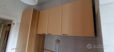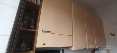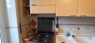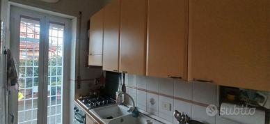 La cucina completa di elettrodomestici funzionanti: forno elettrico Indesit, piano cottura e frigo a incasso Rex Zanussi con doppio motore (frigo e congelatore). Si compone di 5 pensili con altezza 95 cm. e altri tre con altezza 70 cm. La lunghezza totale del mobile con lavello e macchina del gas, da parete a parete, è pari a 250 cm. L'altezza del mobile frigo da terra è 250 cm.