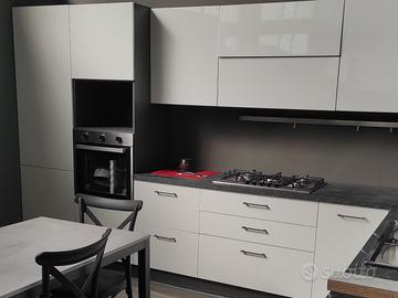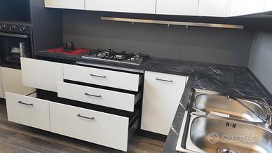 Cucina nuova con frontale bianco lucido con fusto interno colore grigio orione effetto cemento. La cucina in foto misura: 380 x 290 cm. ca --quasi 7 mt. e si può modificare e adattare alle vostre misure grazie ad un top in laminato sp.4 cm incluso nel prezzo da tagliare e forare. Zoccolo antracite, così pure alzatina in alluminio h. 1 x 2 cm. Struttura in nobilitato, classe e1, a basso contenuto di formaldeide, bordata abs da 1 mm. Ante, cassetti e cestoni ammortizzati grazie a cerniere rallentate della Blum. Scocca interna con schiene rinforzate da 6 mm. Elettrodomestici compresi: -Frigo 320 lt lordi con freezer grande sotto -Forno ventilato -Piano cottura 5 fuochi inox con griglie in ghisa -Lavello 2 vasche inox -Cappa ad incasso con filtri lavabili in lavastoviglie Predisposizione per lavastoviglie da 60 a scomparsa o a vista -non compresa nel prezzo- Possibilità di trasporto e montaggio con prezzo da calcolare. Possibilità di finanziamento. Disponibili per fare un disegno senza impegno; inviateci le vostre misure al numero: -- Andrea