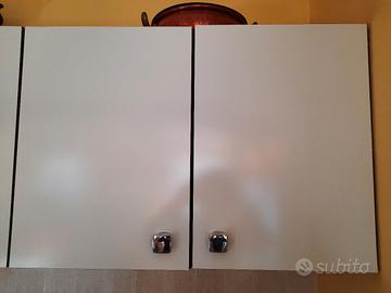 Cucina bianca usata in ottime condizioni. Composta da: - 4 coppie di pensili doppia anta 80cm (2 ante) altezza 55cm profondità 35cm; - 2 pensili da un'anta 40cm altezza 55cm profondità 35cm; - 1 angolo pensile 66cm lati contro il muro altezza 55cm anta 43cm; - 1 pensili scolapiatti 90cm altezza 55cm profondità 35cm; - 1 mobile cucina 4 ante e 4 cassetti 160cm altezza 90cm profondità 47cm