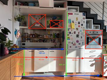 Vendo cucina bianca con top in acciaio inox. Comprensivo di piano cottura elettrico Rex Keramic. Viene venduta completamente svuotata dagli elementi accessori presenti in foto. Non comprensiva di forno, frigo, microonde e cappa aspirante. Comprensiva di - 3 ante - 3 cassetti - colonna con vano frigo da incasso Possibilità di chiudere la zona cottura con ante a soffietto (attualmente rimosse ma disponibili). Possibilità di utilizzarla come piccola cucina eliminando colonna frigo e forno. (Seconda foto) Misure nell’ultima foto. Smontaggio e trasporto a carico dell’acquirente.