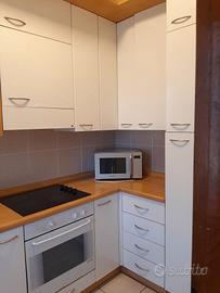 cucina usata, in buono stato con lavastoviglie seminuova, forno buono e funzionante, piano cottura in vetroceramica funzionante ma con alcune parti scheggiate, frigorifero funzionante. Ancora montata visibile.