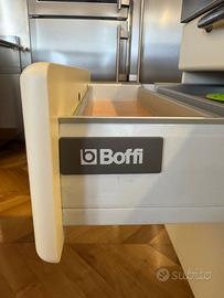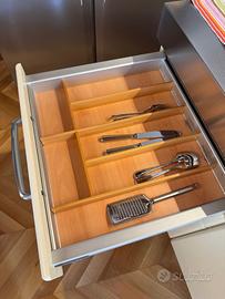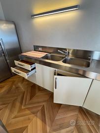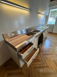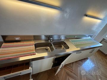 Piano di lavoro in acciaio inox e lavello stampato a due vasche, rubinetto, dispenser sapone, cassettiera con 3 cassetti e portaposate, cinque ante, alzata di protezione di protezione muro 18,5cm.