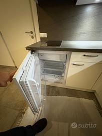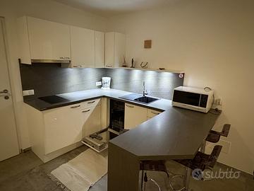 Piccola cucina ad angolo, di un anno, usata poco e in vendita per ristrutturazione della casa. lavastoviglie da 45, piastra a due fuochi, frigo basso, forno microonde. 245 per 175, più penisola.