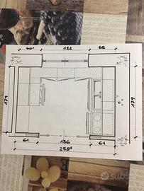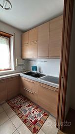 Cucina completa di elettrodomestici: frigorifero, piano cottura, forno e lavastoviglie escluso rubinetto.