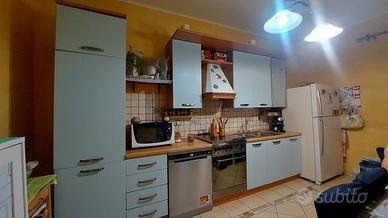 Pensili più basi, mt 2,40 di lunghezza, con top, mensolone sopra i pensili e zoccoletto + cappa + lavello inox doppia vasca (no rubinetto) + tavolo (colonna frigo trasformata in dispensa) €300;