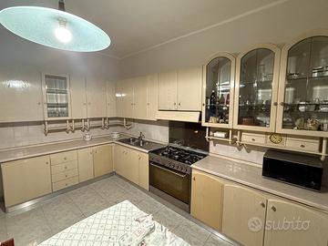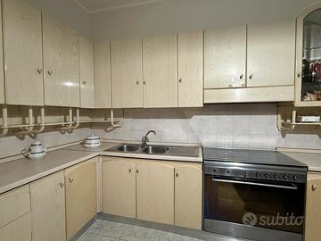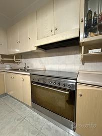Cucina angolare 4 m per 2,60 m color beige. Comprende lavello con due vasche e gocciolatoio, vetrinette, fornello a 5 fuochi e forno. Il forno é da aggiustare. Per ulteriori informazioni contattare.