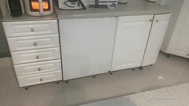 Lavabo 2 vasche, cassettiera 5 cassetti, sportelli da terra con angolo e 2 vetrinette, tavolo 6 posti allungabile, 5 sedie acciaio con seduta simil pelle nera.