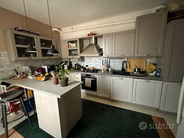 Cucina classica in legno pitturata color grigio chiaro con penisola il forno la lavastoviglie il lavandino con il miscelatore sono stati cambiati di recente, il frigo va venduto separatamente, lo smontaggio e trasporto a carico dell’acquirente il prezzo é trattabile