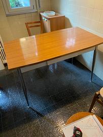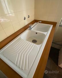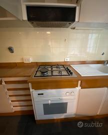 Cucina comprensiva di: 1. Cucina ad angolo composta da: - mobile con doppio lavandino, piano cottura con 4 fuochi a gas e forno ventilato Lunghezza 190cm Profondità 62cm - Cassettiera con 6 cassetti Lunghezza 48cm Profondità 41 - Angoliera Lati 110cm x 110cm Profondità 41 2. Tavolo da pranzo Altezza 75cm Lunghezza 130cm Larghezza 74cm 3. Mobile porta-scope in formica lucida Altezza 200cm Larghezza 60cm Profondità 37cm
