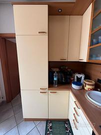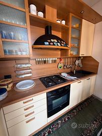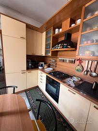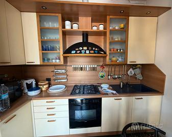 Cucina angolare con annessa penisola + elettrodomestici e 3 sedie. Tutto in ottimo stato. 3*166 m. Colore: crema e ciliegio chiaro. Elettrodomestici: frigorifero e congelatore a incasso; forno; lavastoviglie.