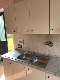 cucina bianca con lavello, gruppo lavellocon cucina a gas gpl . con una vetrina ed un tavolo allungabile e quattro sedie. abbastanza buone per una seconda casa al mare o montagna.