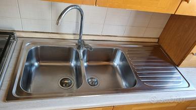 Cucina componibile completa in legno faggio, sviluppata su 5 metri lineari totali. La struttura si compone di un lato principale da 380 cm (con lavello, piano cottura e basi con cassetti e colonne) e un lato da 120 cm con colonna frigo e forno da incasso. Tutti gli elettrodomestici sono inclusi e funzionanti, ad eccezione del congelatore. Caratteristiche principali: Struttura: ►Lunghezza totale: 5 metri ►Profondità basi: 62 cm ►Altezza basi: 82 cm ►Pensili superiori: altezza 105 cm, ►profondità 35 cm ►Alcuni pensili con ante a vetro/rete metallica ►Cassettiera con 4 cassetti ►Colonne con cestoni estraibili in metallo ►Top incluso (in caso di modifica strutturale richiede sostituzione del top) Elettrodomestici inclusi: ►Piano cottura a gas 4 fuochi in acciaio inox con paravento ►Forno da incasso funzionante ►Frigorifero da incasso – funzionante ►Lavello doppia vasca in acciaio inox da 120 cm con sgocciolatoio e miscelatore monocomando Interni: ►Scolapiatti a doppio ripiano in acciaio inox ►Cestoni estraibili in metallo nelle colonne ►Colonna porta bottiglie estraibile Condizioni: usata, buone condizioni generali