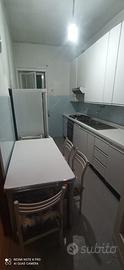 Cucina completa a pensili alti con 4 fuochi, doppio lavello + scolapiatti, frigo, tavolo e sedie, in ottimo stato. Misure del sotto 430x62x90 e sopra 430x35x120.