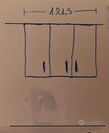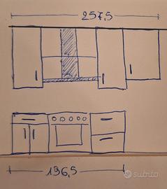 Cucina composta da: (misure: larghezza, profondità, altezza) 3 pensili ad 1 anta 60x34x110, 47,5x34x110 60x34x90 1 cappa larga 90 1 mobile a terra con ante e cassetto 73x60x85 1 mobile a terra con 2 cassettoni scorrevoli 61x60x85. La cucina a gas della seconda foto NON è disponibile. (fino qui riferimento alle prime 4 foto). 1 pensile a 2 ante con scolapiatti 80x47,5x110 1 pensile ad 1 anta 41,5x47,5x110 (fino qui riferimento all' ultima foto). Nessun lavandino. Il disegno della quinta immagine fa riferimento alle prime tre foto; l'ultimo disegno alla quarta foto. Tutto usato, ma molto ben tenuto. Vendo tutto ad € 220. Smontaggio e trasporto con ascensore e/o scale a cura dell'acquirente. NON SPEDISCO.