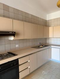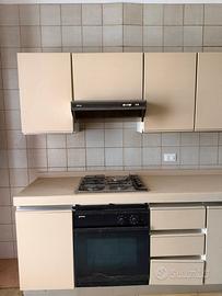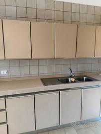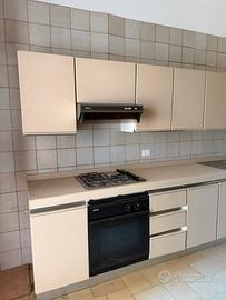 Cucina composta da piano cottura, forno, lavello doppio e frigorifero.