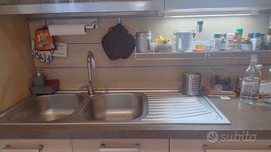 16 anni, completa di lavello, fuochi a gas, cappa, lavastoviglie (MT.3 lungh. MT.2,20 alt.) + colonna forno cm.60x60 alt.2,20. Piano marmo korean cm.4+boiserie. Cassetti con cestoni + Mobile dispensa tre ante (largh.134 alt.220 prof. 34). Elettrodomestici Whirlpool perfettamente funzionanti. Si precisa che in pochi punti il rivestimento si è sollevato come indicato nelle foto.