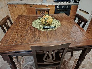 Cucina in legno massello completa di lavello, piano cottura, lavastoviglie, frigo (forno non funzionante) e tavolo allungabile con 6 sedie, come in foto in ottime condizioni. Misure: -Lato lavello lunghezza 307 x 60 cm -Lato pensili Lunghezza 240 x 60 cm, altezza 226 cm -Frigorifero: 185 x 59 cm -Tavolo 120 x 120 cm (allungabile 240 x 120 cm). Smontaggio e trasporto a cura dell'acquirente. Prezzo trattabile. Disponibile da luglio.