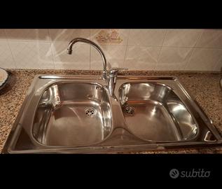 cucina completa di piano cottura acciaio, lavandino doppio acciaio, forno, frigo, freezer e piano lavoro in granito rosa.
