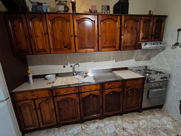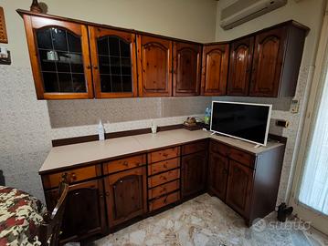 Cucina componibile in legno massello marca Gatto con tavolo rotondo e sedie. Forno e lavastoviglie NON inclusi. Misure 240x120 (zona con mobile ad angolo 300x60 zona con lavello Smontaggio e trasporto a carico dell'acquirente.