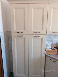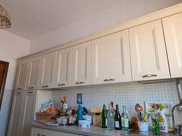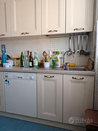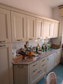 Vendo cucina completa in stile classico/shabby chic, molto ben tenuta (rinnovata un anno fa) e funzionale. La cucina presenta una finitura color crema/avorio con venature legno a vista e graziose maniglie a conchiglia in ceramica e metallo brunito. Composizione e caratteristiche: la cucina è disposta su due lati (lineare + zona cottura) ed è composta da: Zona Lavaggio: Ampio piano di lavoro, lavello in acciaio inox a una vasca con sgocciolatoio, basi sottostanti e pensili superiori. Zona Cottura: Piano cottura a gas 4 fuochi, forno a incasso coordinato Glem e cappa aspirante (da sostituire) integrata nel pensile. Contenimento: Colonna dispensa a doppia altezza molto capiente e mobile a giorno con mensole decorative. Elettrodomestici inclusi: Lavastoviglie Miele (top di gamma), Forno Glem, Piano Cottura Rex. (microonde e piccoli elettrodomestici sul piano non sono inclusi). Accessori: Tavolo coordinato e sedie inclusi nell'offerta. Stato del mobile: La cucina è in ottime condizioni generali, rinnovata solo un anno fa. Le cerniere e le guide dei cassetti sono perfettamente funzionanti. Non presenta rigonfiamenti da umidità. Aspiratrice da sostituire. Misure: Lato Lavello: Lunghezza 357cm Lato Cottura: Lunghezza 180 cm Tavolo: 70 cm x 121 cm