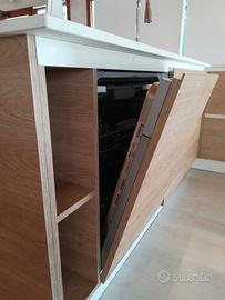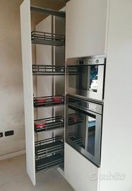 Cucina componibile ad angolo accessoriata; zona lavaggio e cottura misura 274x218h.89,5 cm, lato colonne misura 156x60h.216 cm, zoccolo in metallo h.12 cm e profilo gola metallo per l'apertura tutto in finitura bianco. La cucina è in laminato effetto legno nodo naturale (basi) e laminato effetto resina bianco (colonne). Piano di lavoro in quarzo Silestone bianco finitura suede spessore 2 cm. Cassetti e ante con chiusura ammortizzata. Elettrodomestici inclusi marchio Whirlpool sono: lavastoviglie incasso da 60cm, frigocongelatore combinato 320 lt ad incasso, forno multifunzione e microonde. Il piano cottura induzione modello Hotpoint. Lavello Blanco due vasche in Granitek colore bianco con miscelatore Newform acciaio canna alta con doccetta. Cappa. Cucina nuova di esposizione prezzo listino 21.400 proposta in offerta a €8900. Trasporto e montaggio esclusi, qualora fossero necessari questi servizi possiamo quotarli. Se interessati è visionabile e/o possiamo inviare altre foto e studiare soluzioni di montaggio ad hoc per il vostro ambiente. Siamo disponibili per dare ulteriori informazioni anche telefonicamente al numero 0424560526